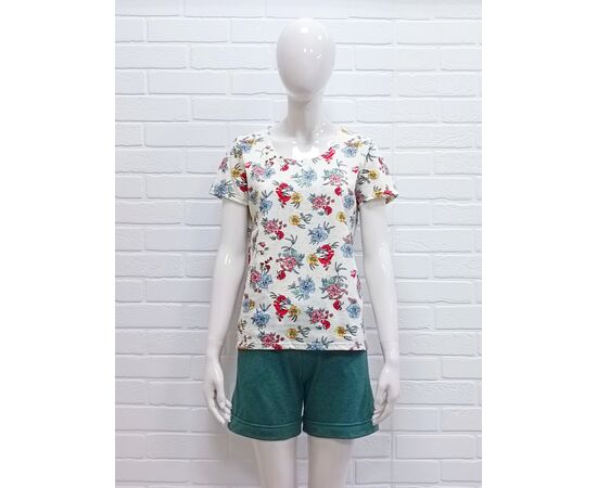 Летний комплект с шортами. Универсальный наряд, который пригодится в отпуске на море, а также для пляжного отдыха на лето. Футболка с красочным принтом цветы, шорты однотонные с карманами.