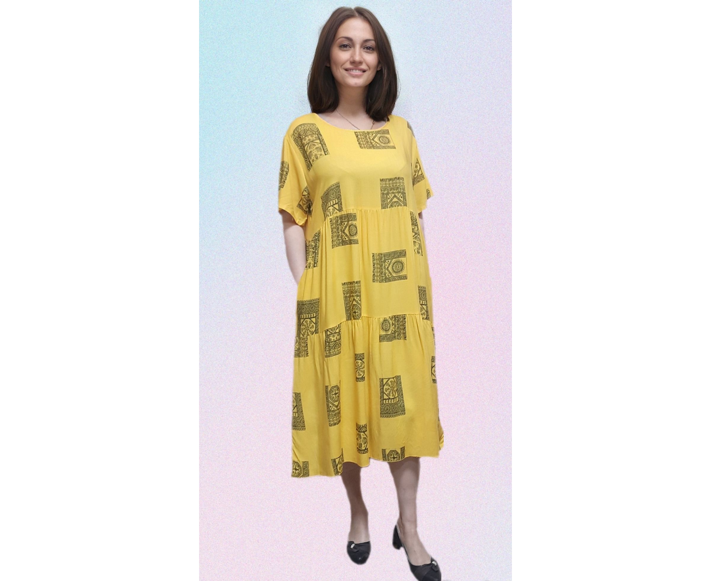 Летящее платье с принтом – синоним женственности и счастливого лета.Эта летняя одежда с коротким рукавом подарит максимальную прохладу в жару. Женское платье миди без пуговиц сможет исполнить много ролей в вашем гардеробе. Штапельная модель оверсайз идеально подходит девушкам с любым типом фигуры. Особенно ее полюбят полные модницы больших размеров – платье свободного кроя грамотно умолчит о недочетах на талии и сделает фигуру стройнее и привлекательнее. Красивое воздушное платье отлично подойдет высоким и невысоким красавицам.
