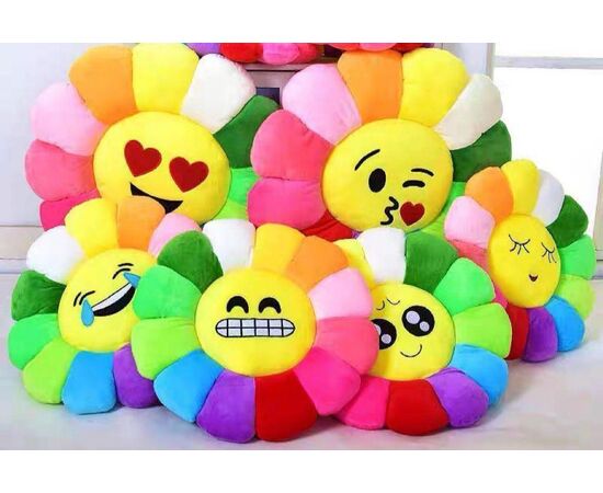 Аксессуар домашнего декора - подушка в форме цветка смайлика. Цветок в виде подушки будет забавной игрушкой для ребенка. Декоративная подушка станет замечательным подарком. Интерьерная подушка шарктойс изготовлена из мягкого плюша, наполнитель синтепон. Специальная форма с выемкой для головы сделает отдых комфортным.