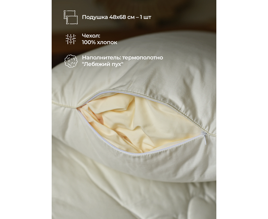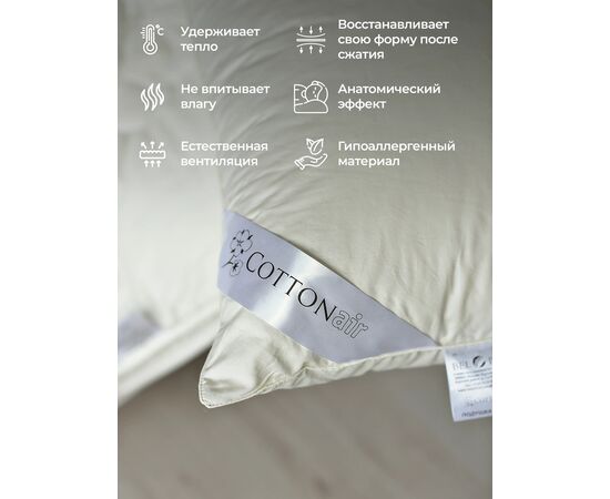 Подушка Бел-Поль Коттон Аир в прочном чехле из сатина – практичный аксессуар для сна. Подушка двухкамерная. Ядро наполнено искусственным лебяжьим пухом. Наполнитель внешней камеры – термополотно с волокнами хлопка.