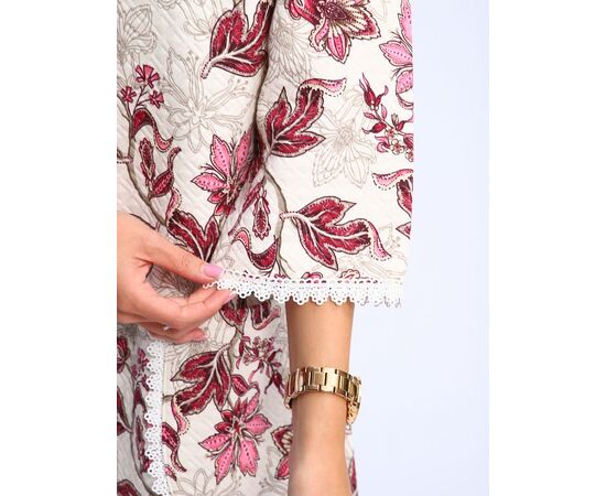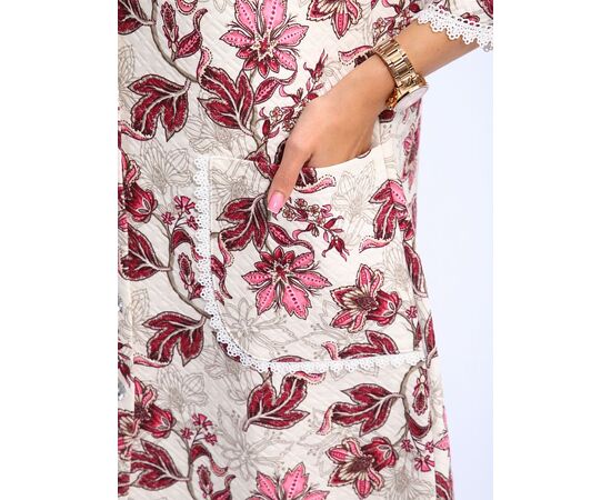 Уютная модель женского халата рукавом и накладными карманами, материал стеганый капитоний. У халата застежка по переду на пуговицы и отложной форменный воротничок. Очень удобный и уютный халат позволит вам чувствовать себя комфортно в любом месте.