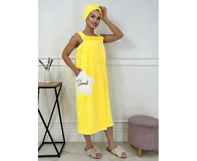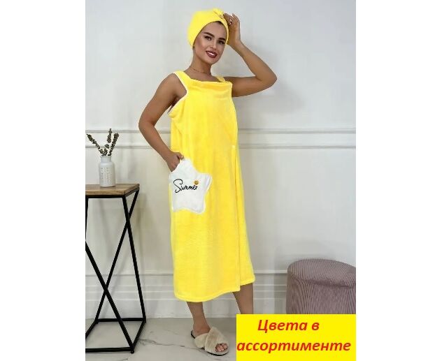 Набор для бани и сауны женский выполнен из мягкой, приятной на ощупь микрофибры. В комплект банных принадлежностей входит: женское полотенце, чалма банная. На полотенце, входящем в комплект банного набора для женщин, расположен вместительный карман, в котором удобно хранить важные для женщины мелочи, банные мелочи. Банное полотенце крепко фиксируется на груди пуговицами. Чалма - шапочка для волос поможет быстрее высушить голову, так как впитывает влагу, а также защитит от теплового удара в парилке.