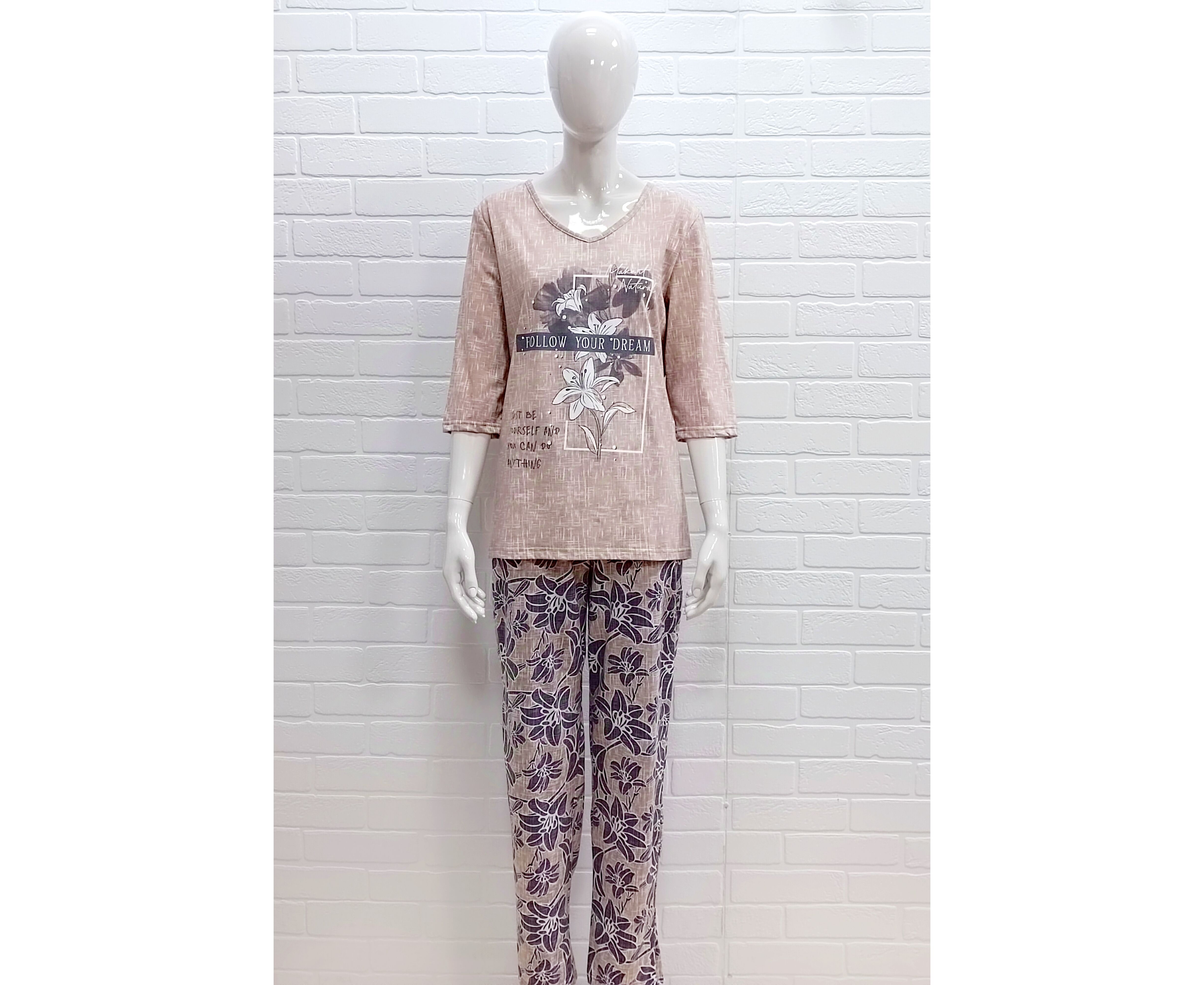 Пижама состоит из длинных брюк и мягкой футболкой с рукавом 3/4. Этот женский костюм подойдет как для зимних вечеров, так и для прохладных летних ночей благодаря качественному материалу. Домашний костюм из хлопка создан для тех, кто ценит мягкость и теплоту.