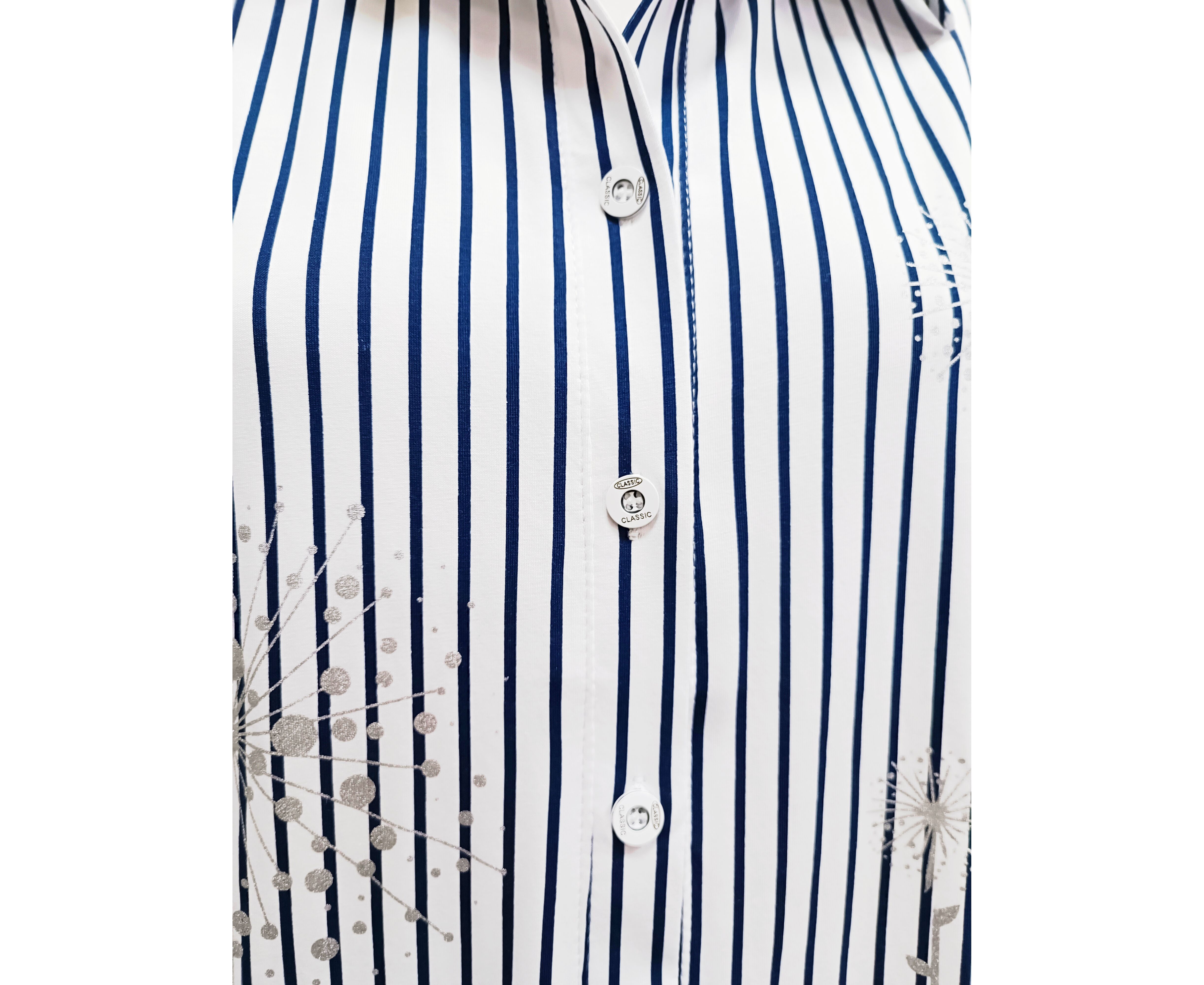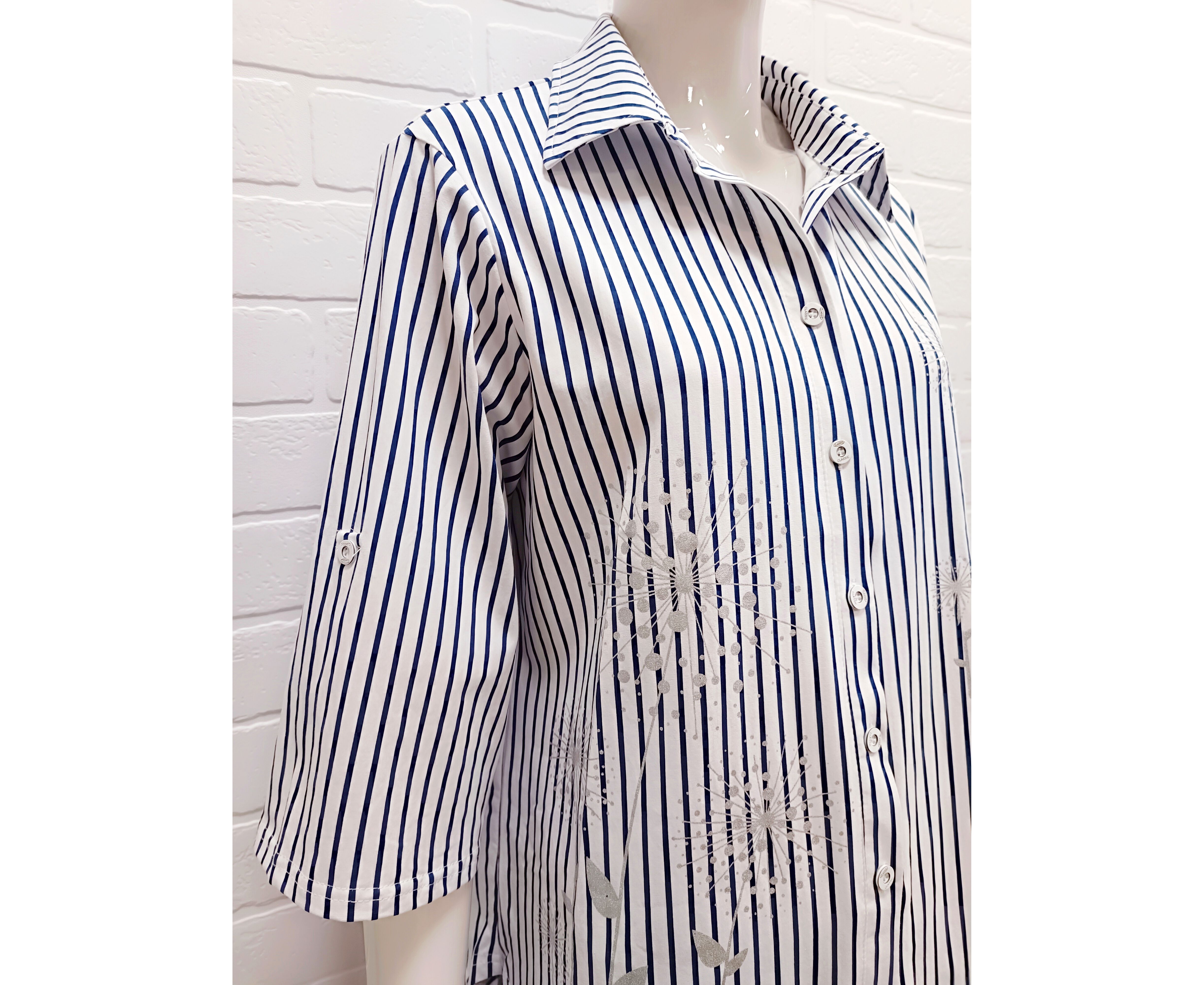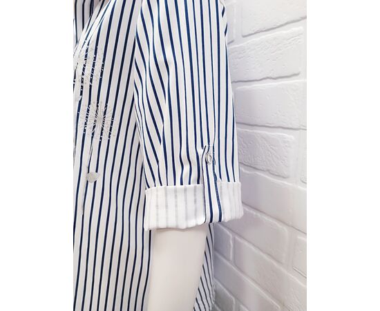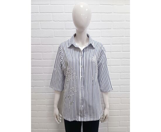 Женская блузка в полоску свободного кроя. Выполнена из мягкой,дышащей и очень приятной трикотажной ткани. Рукав короткий с манжетой на пуговке для регулировки длины. Легкая хлопковая блузка с трендовым принтом в полоску,внесет стильное и приятное разнообразие в ваши повседневные и вечерние образы.