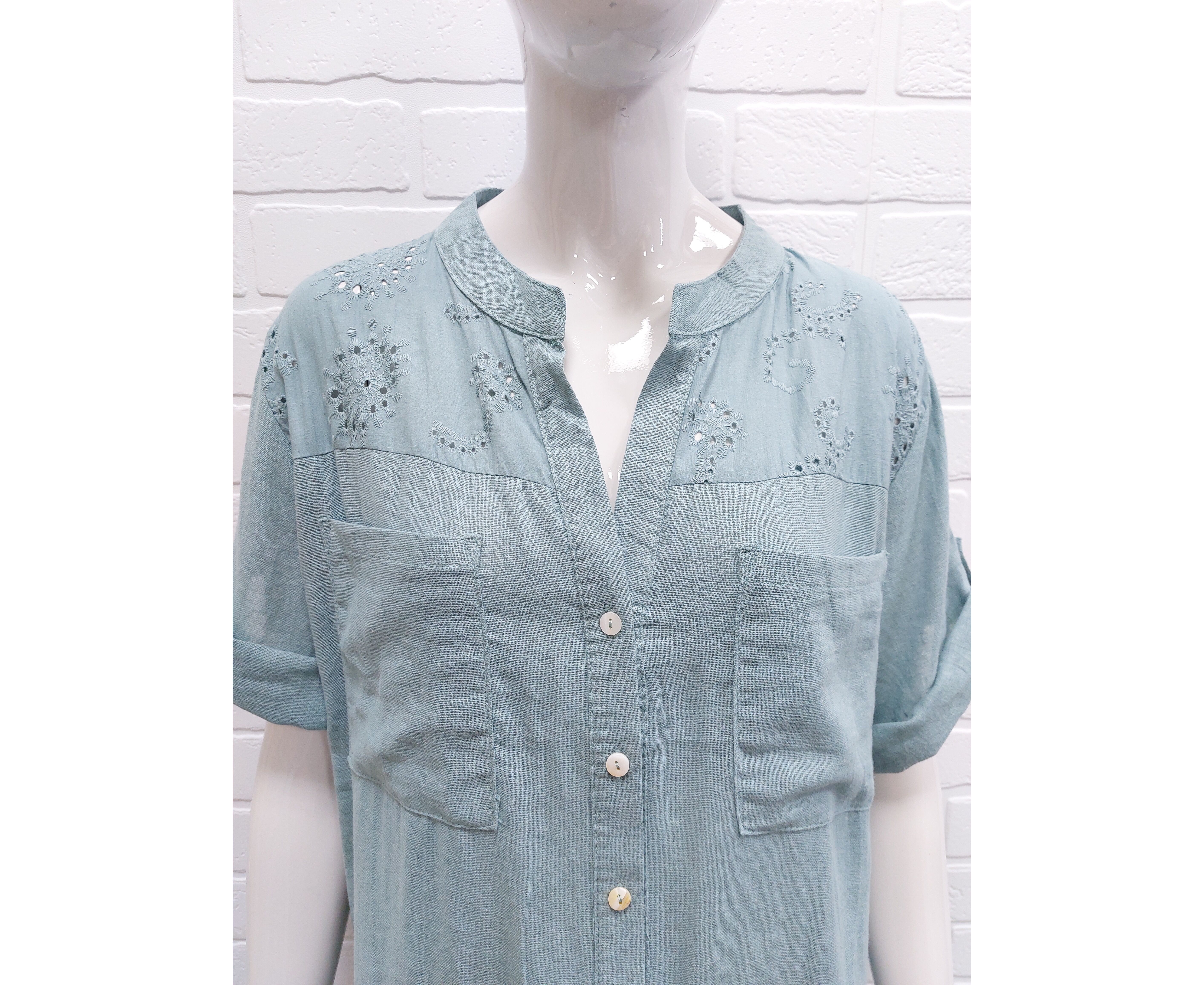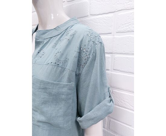 Легкая и удобная льняная блузка с яркой вышивкой на рукавах и карманах придется по вкусу каждой моднице. Короткий свободный рукав делает эту блузку идеальным вариантом для лета, обеспечивая ощущение свежести и комфорта. Незаменимый элемент летнего гардероба для стильных и модных дам.