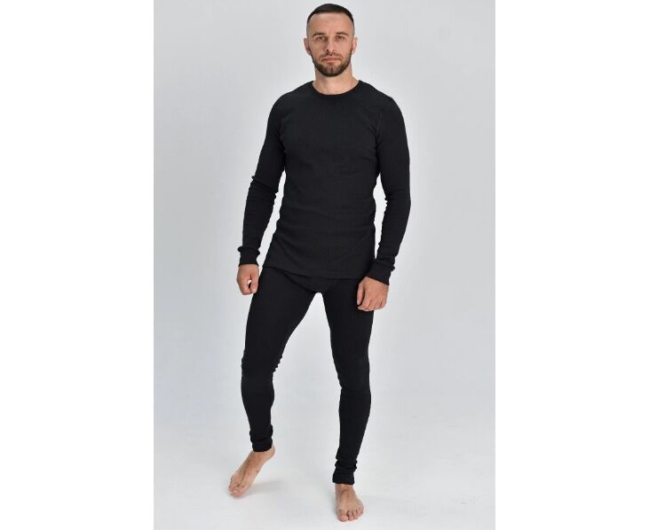 Комплект термобелья для мужчин, выполненный из хлопкового полотна с начёсом. С округлым вырезом горловины и эластичными манжетами. Классические кальсоны дополнены манжетами. Анатомический крой белья не сковывает движений, не натирает, не раздражает кожу, что позволяет свободно двигаться. Это мягкое, приятное к телу и тёплое бельё предназначено для повседневной носки в холодное время года.