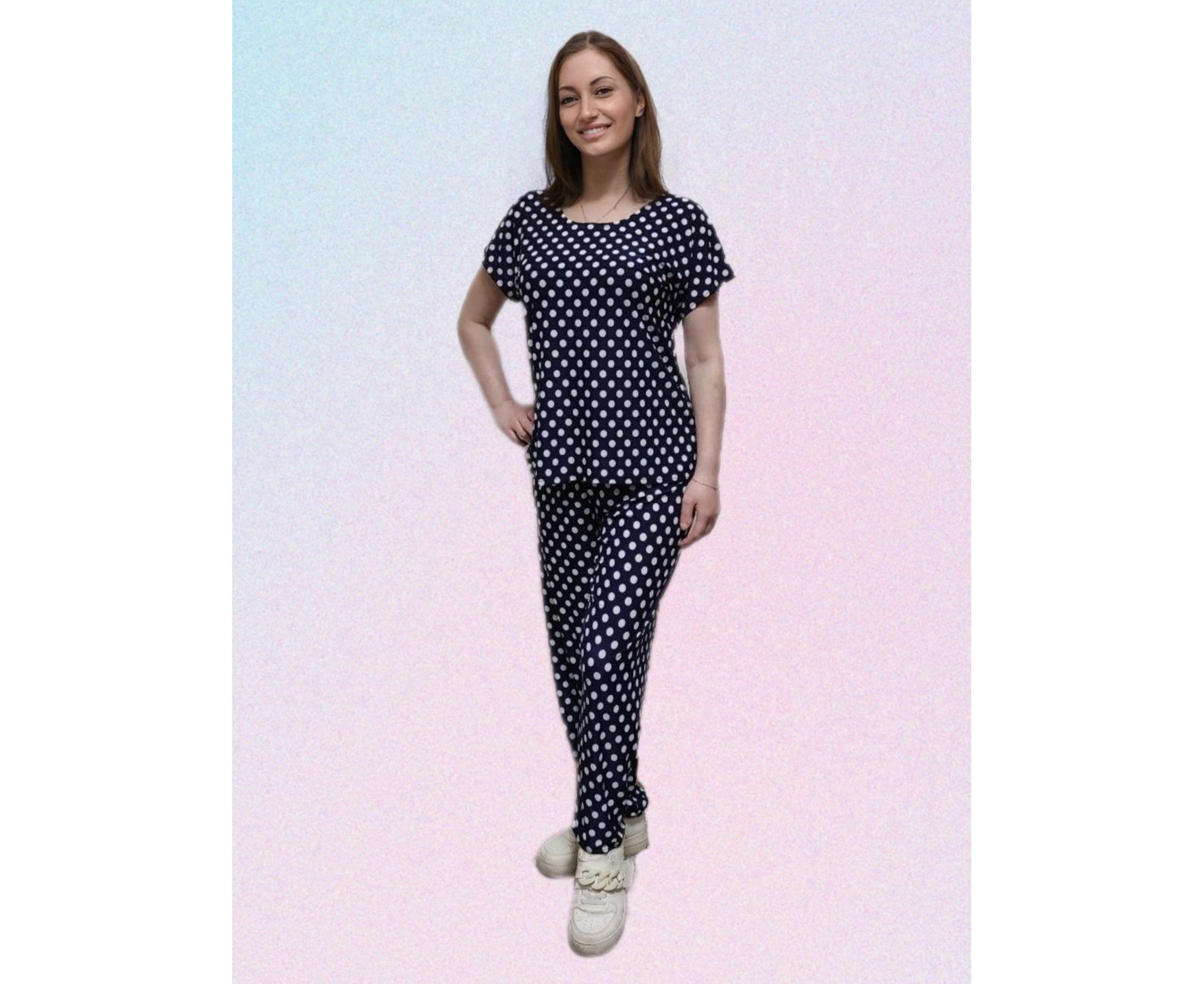 Костюм двойка на лето из легкой ткани. В комплект входят прямые брюки, которые красиво облегают бедра, при этом визуально вытягивают фигуру, и прямая блуза с короткими рукавами, скрывающая возможные недостатки фигуры и подчеркивающая достоинства. Такой костюм будет незаменимым предметом гардероба в летние дни, на работе, на отдыхе, на вечерних прогулках с подругами, а так же как домашний костюм. Костюм сшит из качественной вискозной ткани, она приятна к телу, мягкая и струящаяся. Ткань не дает усадку после стирки, не тускнеет, легко утюжится.