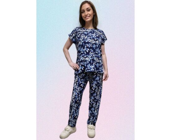 Легкий шелковистый костюм, идеальный для жаркого времени года. Легкие брючки, зауженные к низу на широкой резинке. Туника со спущенным рукавом.