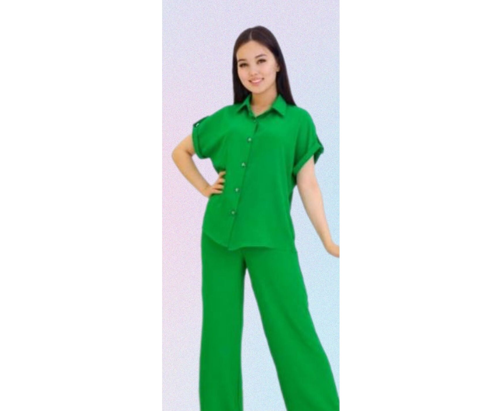 Брючный костюм оверсайз легкий и приятный к телу. Сшит из дышащего материала. Широкие брюки не стесняют движения. Брюки с резинкой в поясе отлично растягиваются и не сдавливают тело. Оригинальный крой блузы с коротким рукавом, никого не оставит равнодушным. Костюм свободный отлично подойдет для дома, йоги, путешествий.