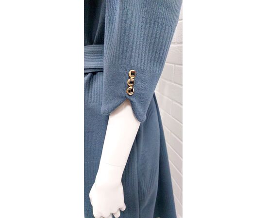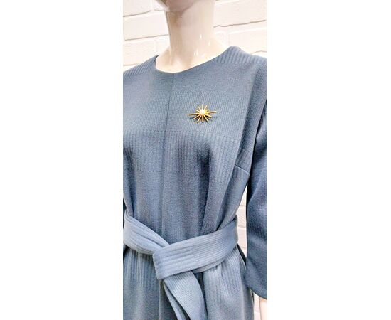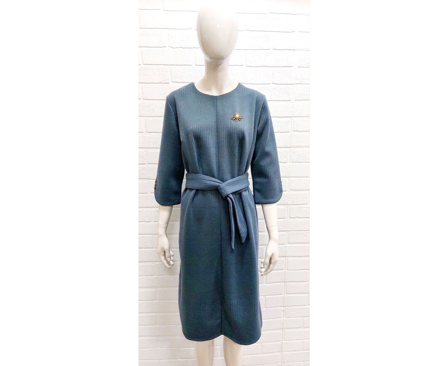 Ткань плотный костюмный трикотаж с имитацией вязки. Платье свободного силуэта, что идеально для женщин с пышными формами. В комплект входит широкий пояс из основной ткани, с помощю которого можно подчеркнуть талию. На груди небольшая брошь. На рукавах ряд пуговиц украшают фигурный вырез.