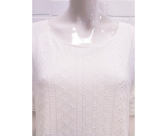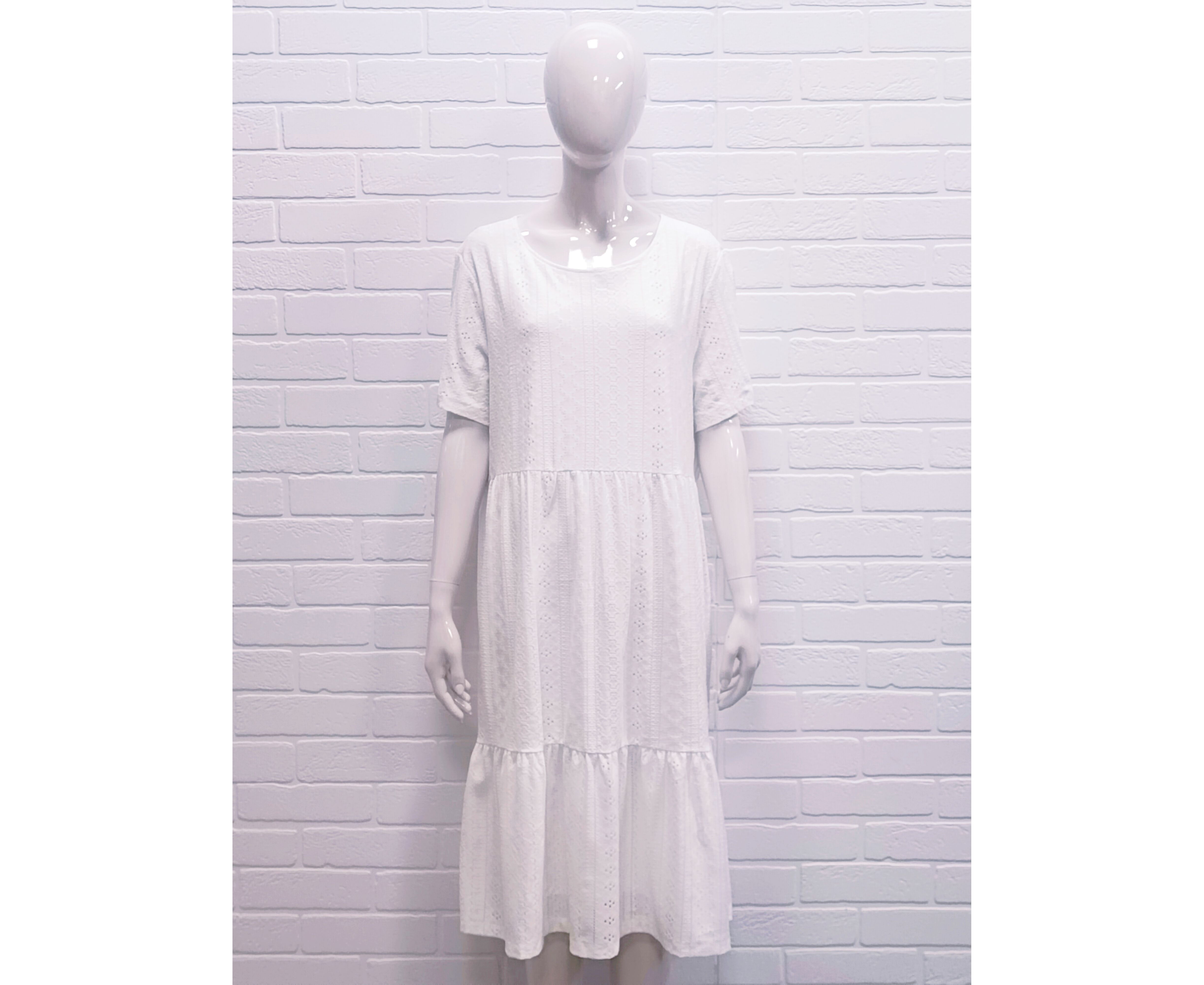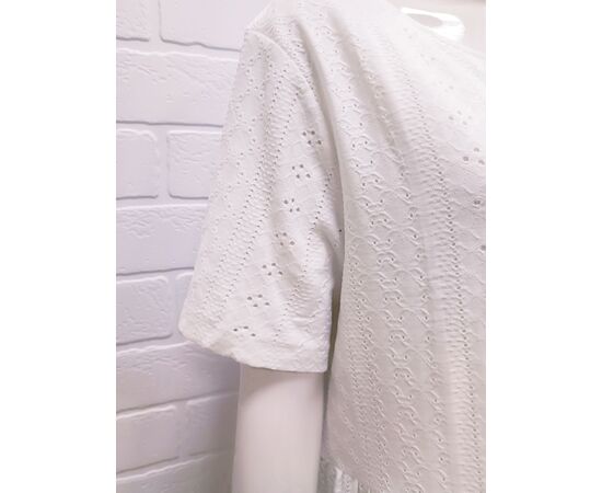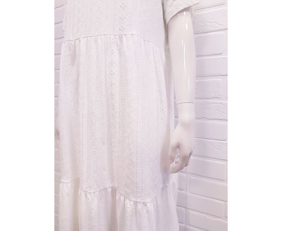 Женское нежное белое платье выполнено из хлопковой ткани (ришелье), на натуральной хлопковой подкладке. Платье полуприлегающего силуэта с двумя воланами. Платье легкое и элегантное, практичное в носке. Платье подойдет для выхода в город, а также на любой праздник.