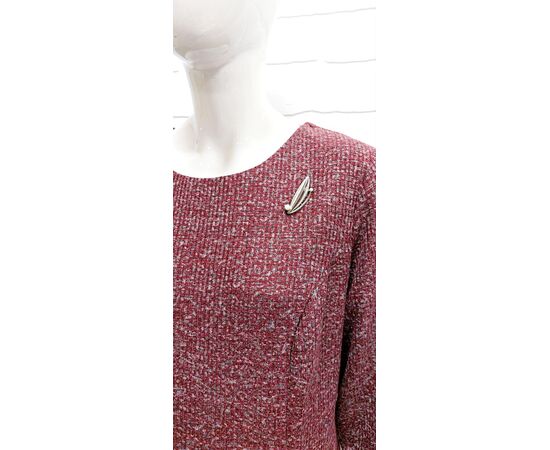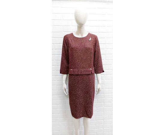 Трикотажное платье, полуприлегающего силуэта, рукав 3/4. Небольшая складка создает имитацию костюма. В состав ткани входит люрекс, что придает ткани праздничный вид. Небольшие украшения завершают образ. На спинке предусмотрены вытачки, что обеспечивает идеальную посадку по фигуре.