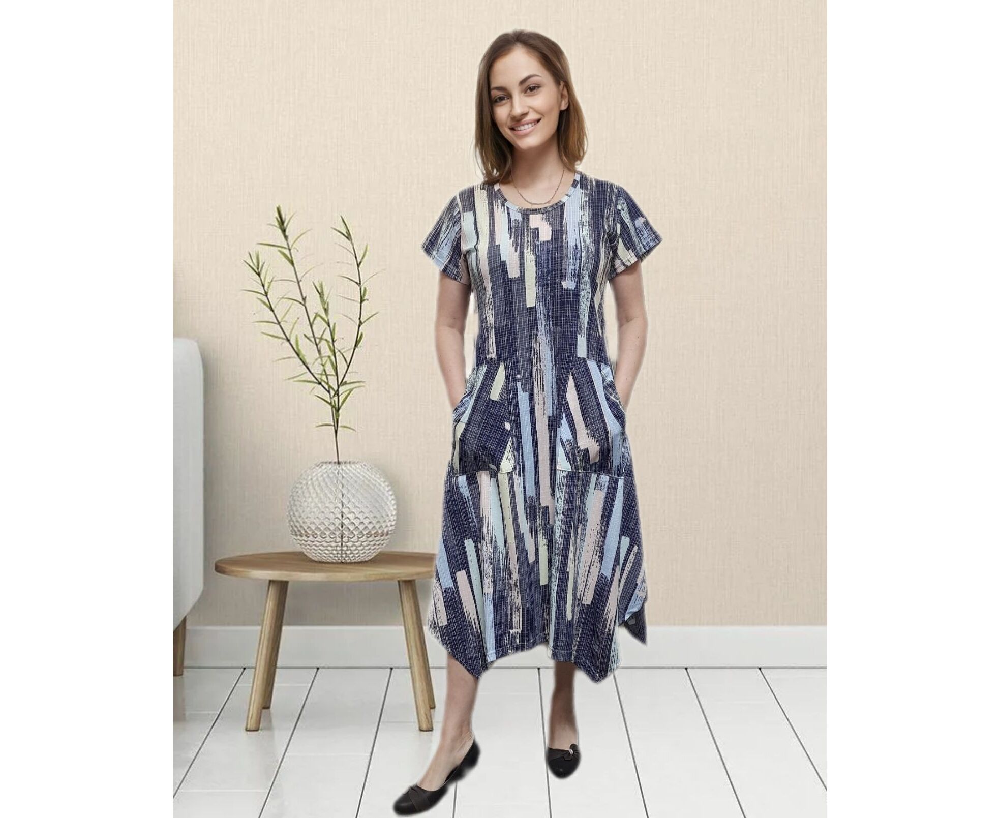 Крой платья создает легкий, летящий силуэт. Худеньким девушкам она поможет создать женственный силуэт. При этом широкий крой делает модель подходящей и для дам с объемными бедрами. Вам не придется носить оверсайз, чтобы скрыть недостатки фигуры. Платье с длиной макси имеет свободное облегание по ширине. Верх платья имеет умеренно свободный крой, к низу по боковым швам силуэт расклешается (в форме трапеции). Горловина круглой формы, вырез неглубокий, рукава короткие. По бокам имеются два кармана.