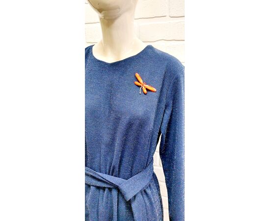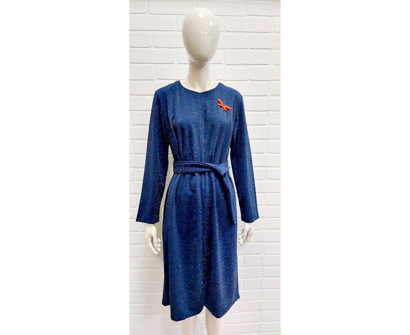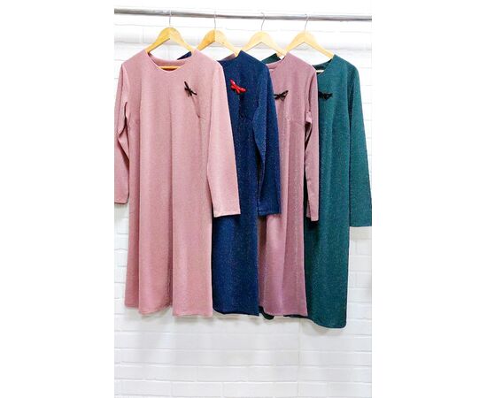 Платье свободного кроя, длина ниже колена, рукав длинный. Благодаря люрексовой нити платье имеет праздничный и нарядный вид. Небольшая яркая брошь в виде стрекозы сделает ваш образ ярким и необычным. В нем идеально сходить в театр или на концерт, сходить в ресторан. встретиться с друзьями.