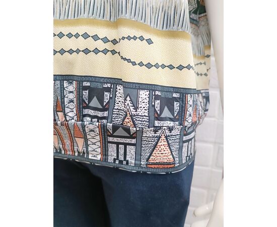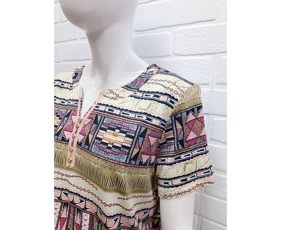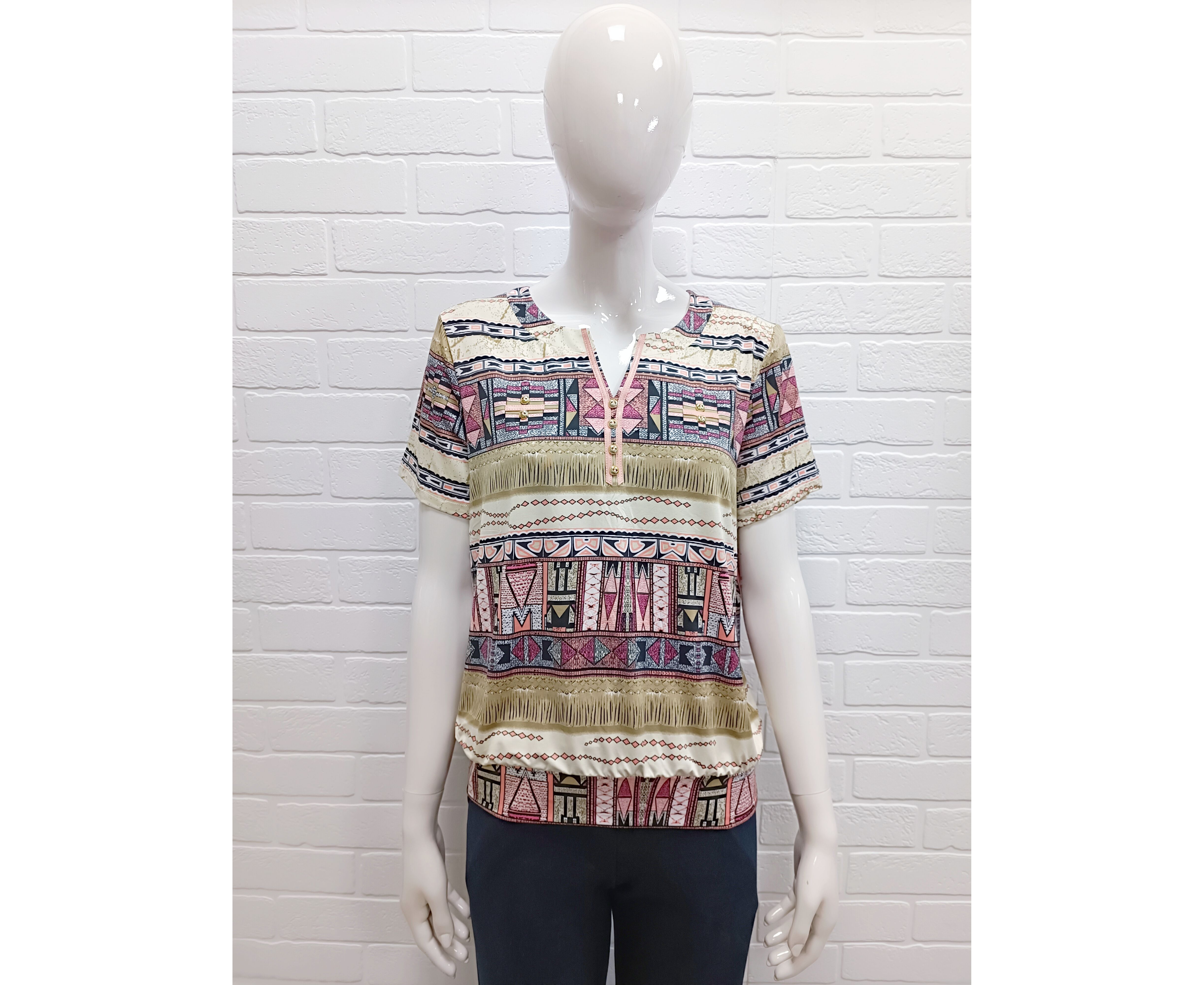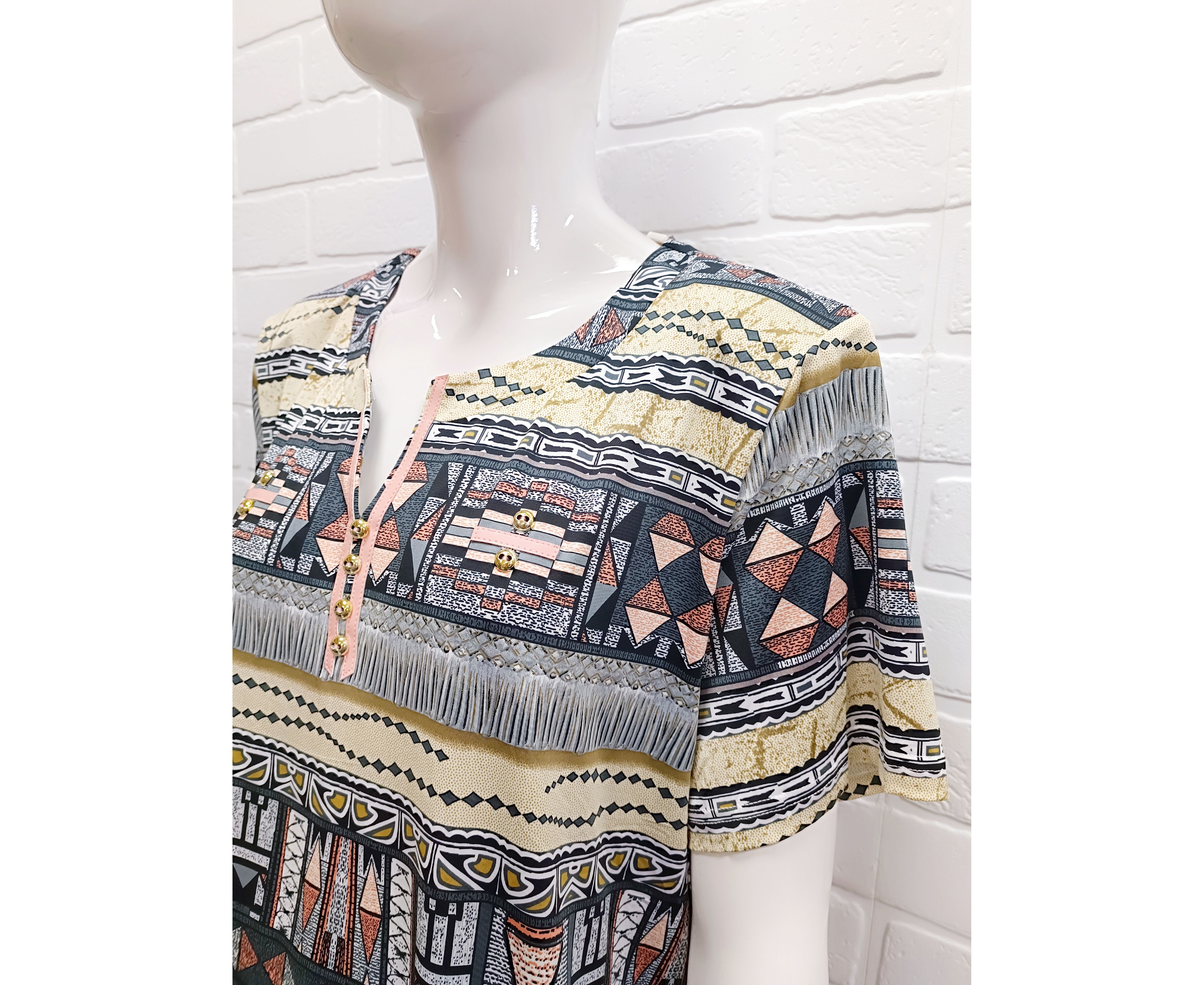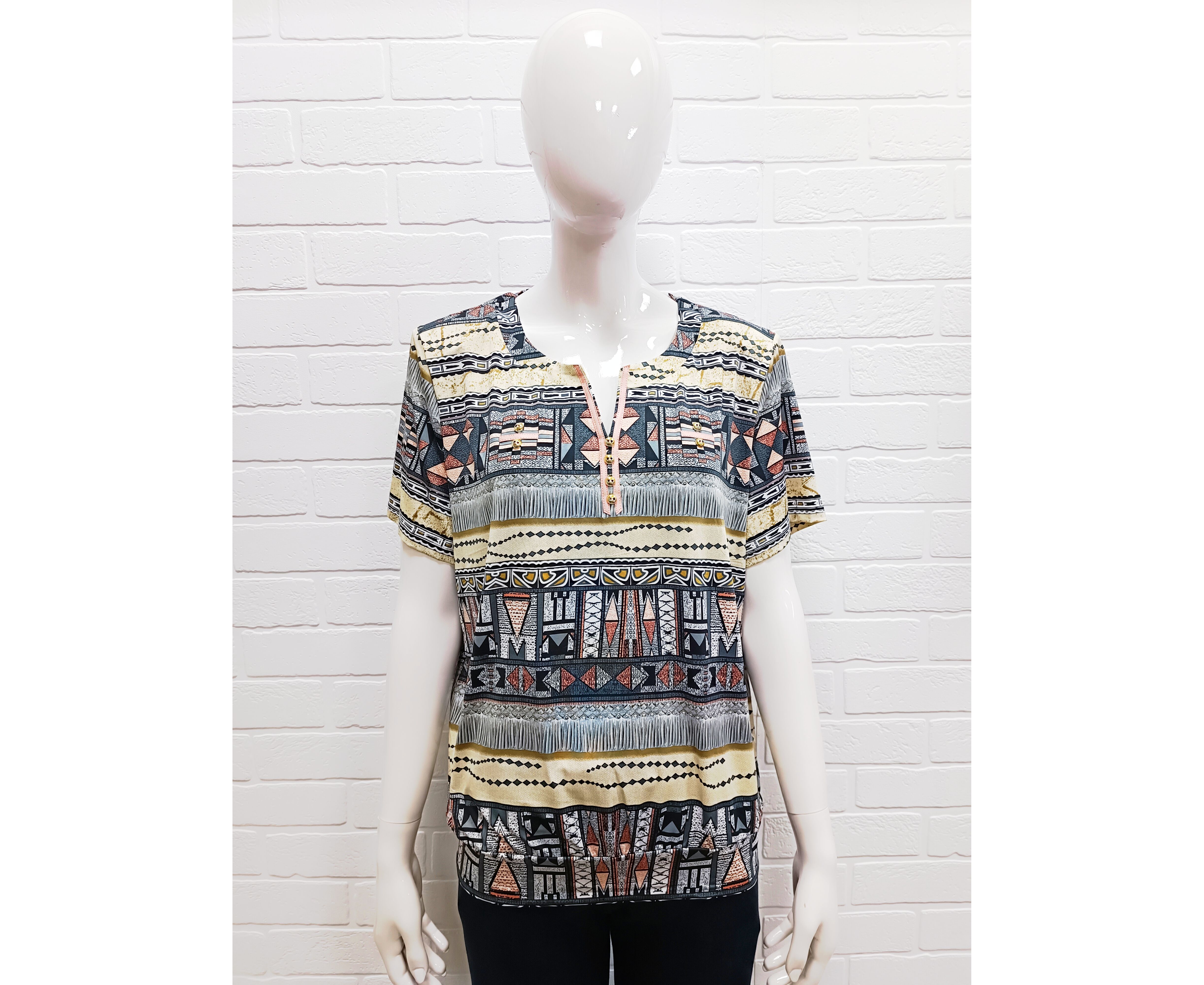 Стильная женская блузка, украшенная экзотическими этническими мотивами и элегантными геометрическими узорами. Мягкая и лёгкая ткань приятная на ощупь. Небольшой V-образный вырез с контрастной планкой и пуговицами визуально удлиняет шею и придаёт образу женственность. Короткие рукава делают модель универсальной как для тёплых прогулок под солнцем, так и для прохладных помещений. Нижняя часть дополнена аккуратной резинкой, которая деликатно фиксируется на бёдрах, при этом не сковывая движений.