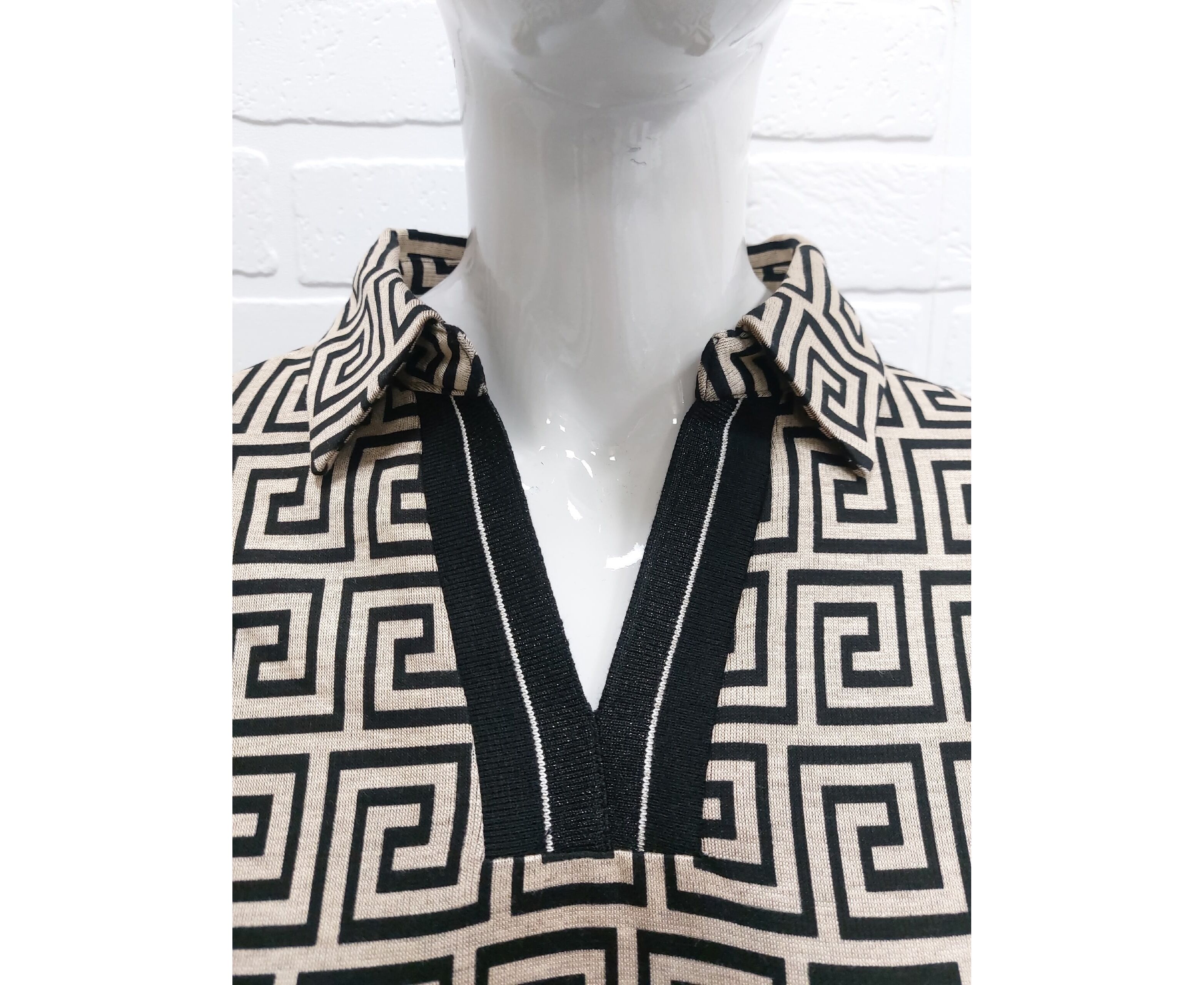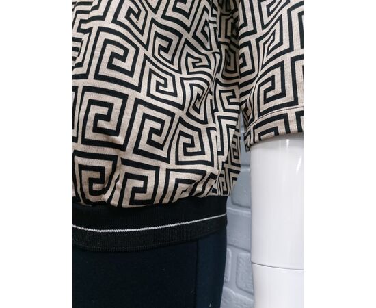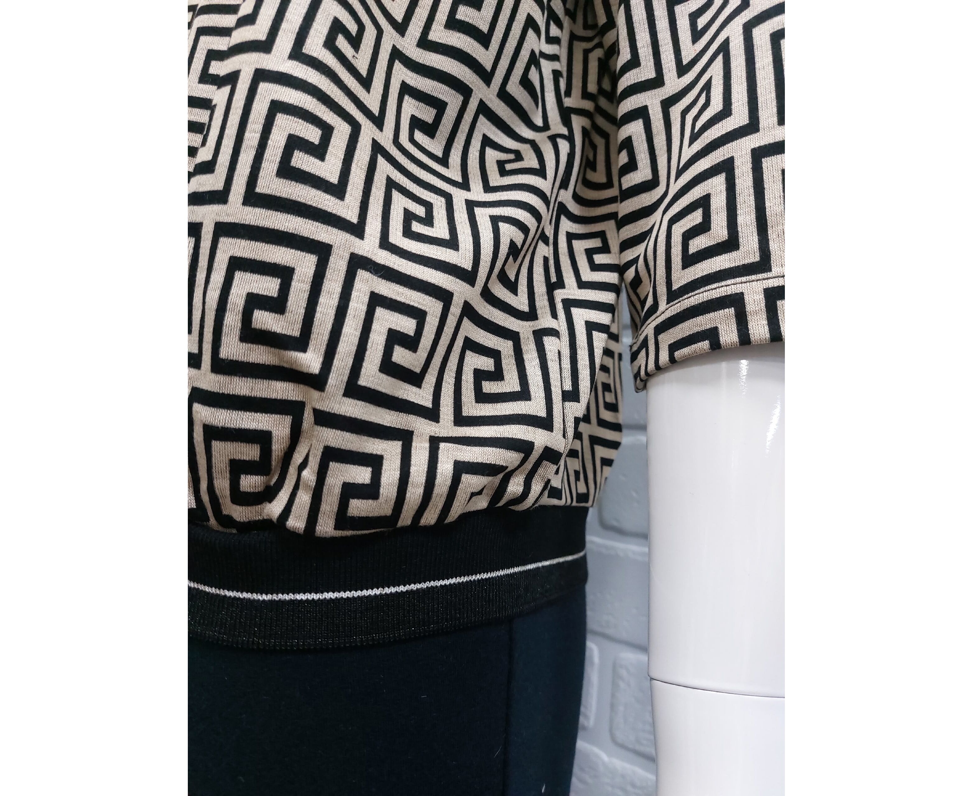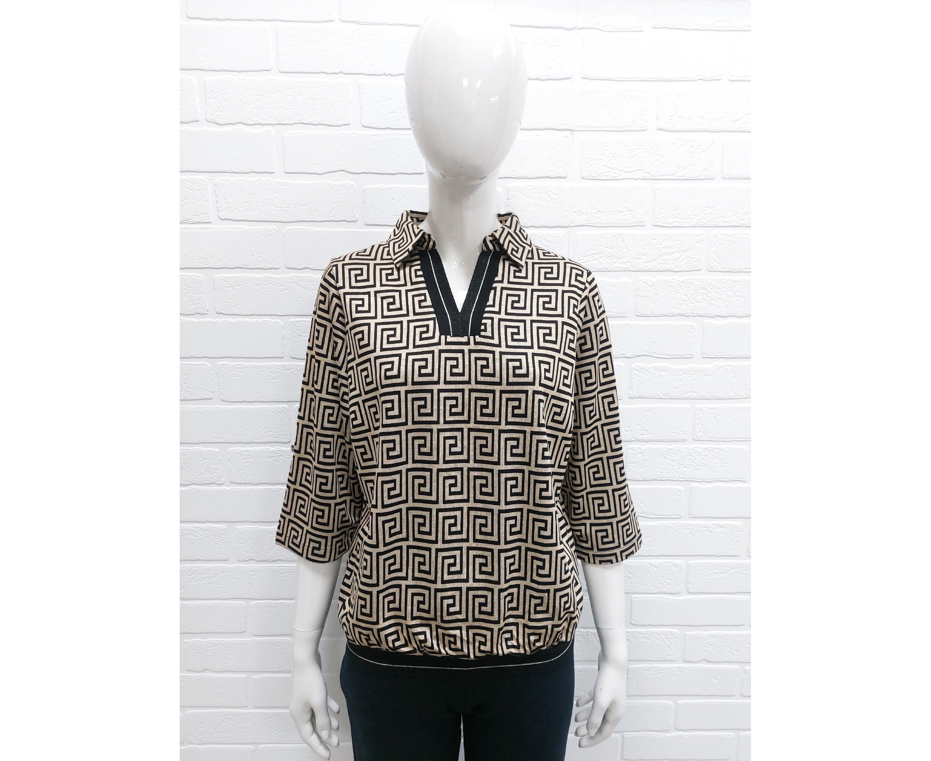 Эта стильная женская блузка выполнена из качественной ткани, состоящей на 95% из вискозы и 5% из лайкры, что обеспечивает мягкость, комфорт и легкую эластичность. Геометрический принт добавляет изделию современности и акцента. Блузка оснащена рукавами 3/4, которые идеально подходят для межсезонья, Отложной воротник и декоративная вставка на груди придают изделию элегантность. Пояс на утягивающей резинке обеспечивает удобную посадку, подчеркивая талию и создавая стильный силуэт. Универсальный крой блузки подходит как для офиса, так и для повседневных образов.
